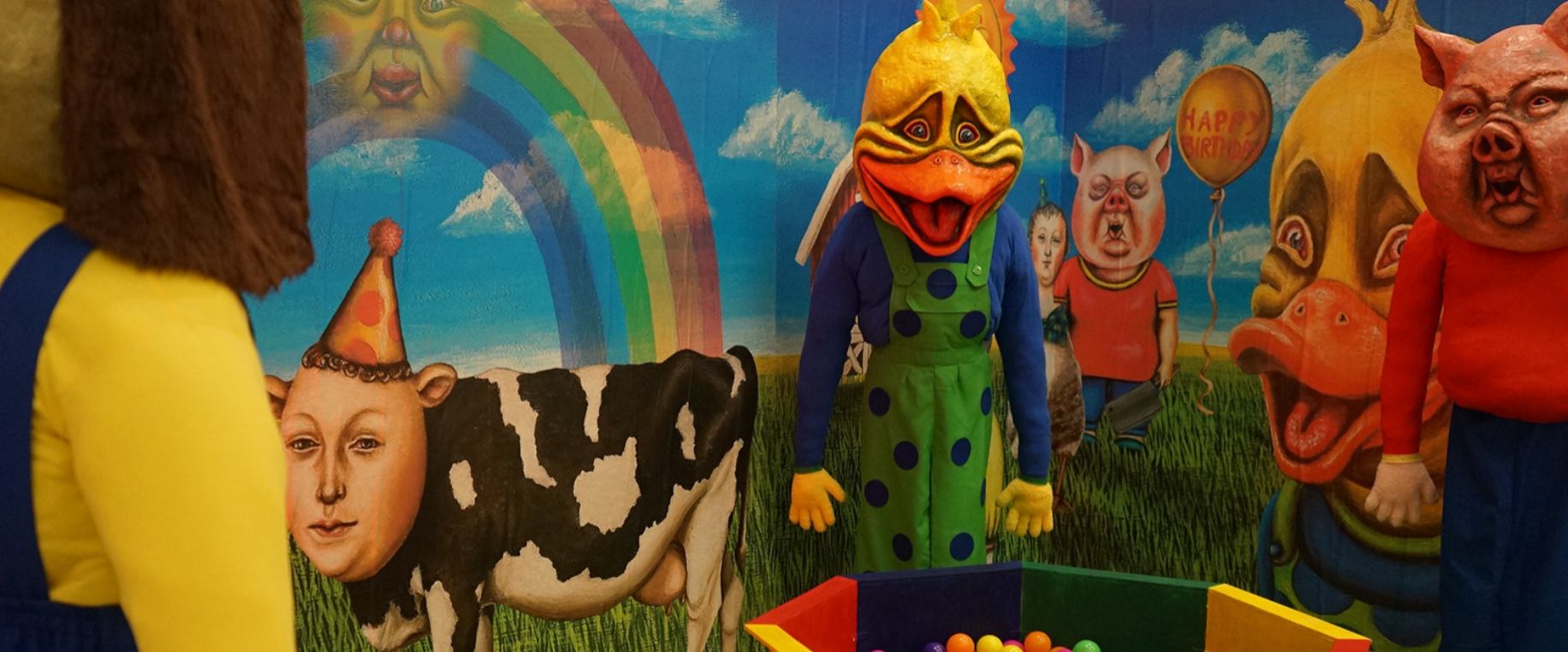 My work is influenced by medieval art, as well as mythology and folklore. This familiar historical imagery is combined with nostalgic, kitsch and surreal elements to evoke an unsettling feeling and a nightmarish quality. My work aims to convey a strange joy or comfort from the nostalgic early 2000 elements and the deep associations people have to this imagery, combined with unsettling elements to create a contrast, evoking a sense of dread, unease and discomfort in the viewer. I often use human animal hybrids in my sculpture and painting to expose the darker sides of human nature in the modern world and capture the zeitgeist, presented as immersive installations with moving image and sound to add to the dissonance.