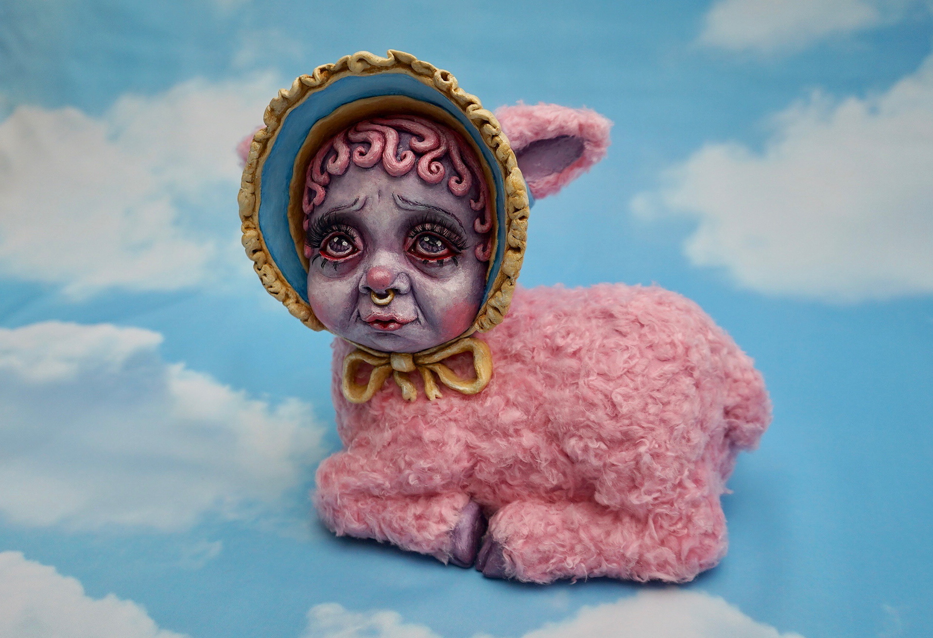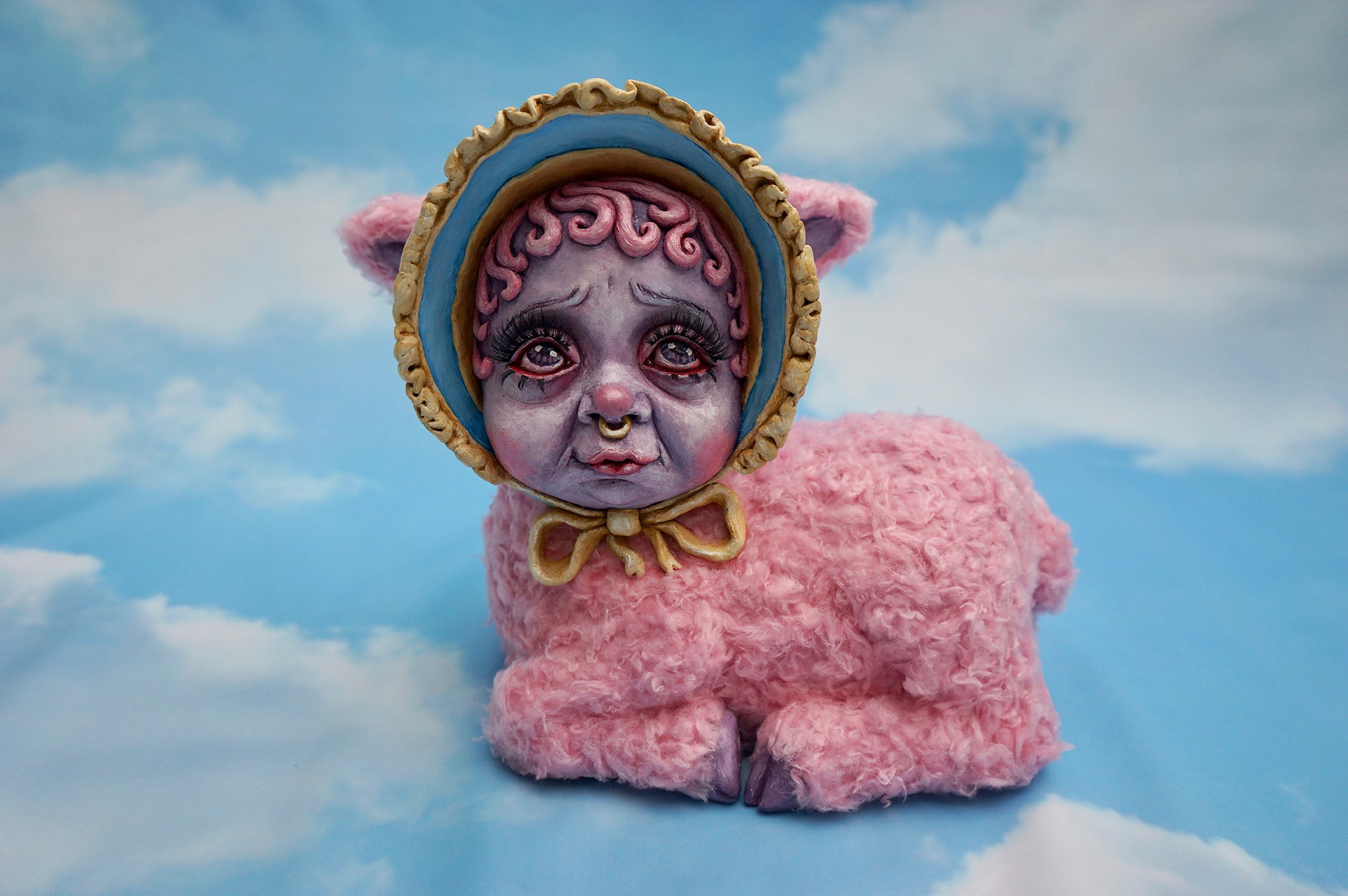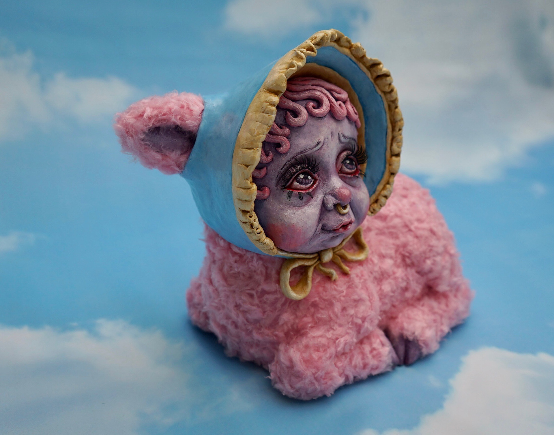 'Baby Clown Cow', 2023, polymer clay, acrylic and faux fur, 25 x 18 x 18cm